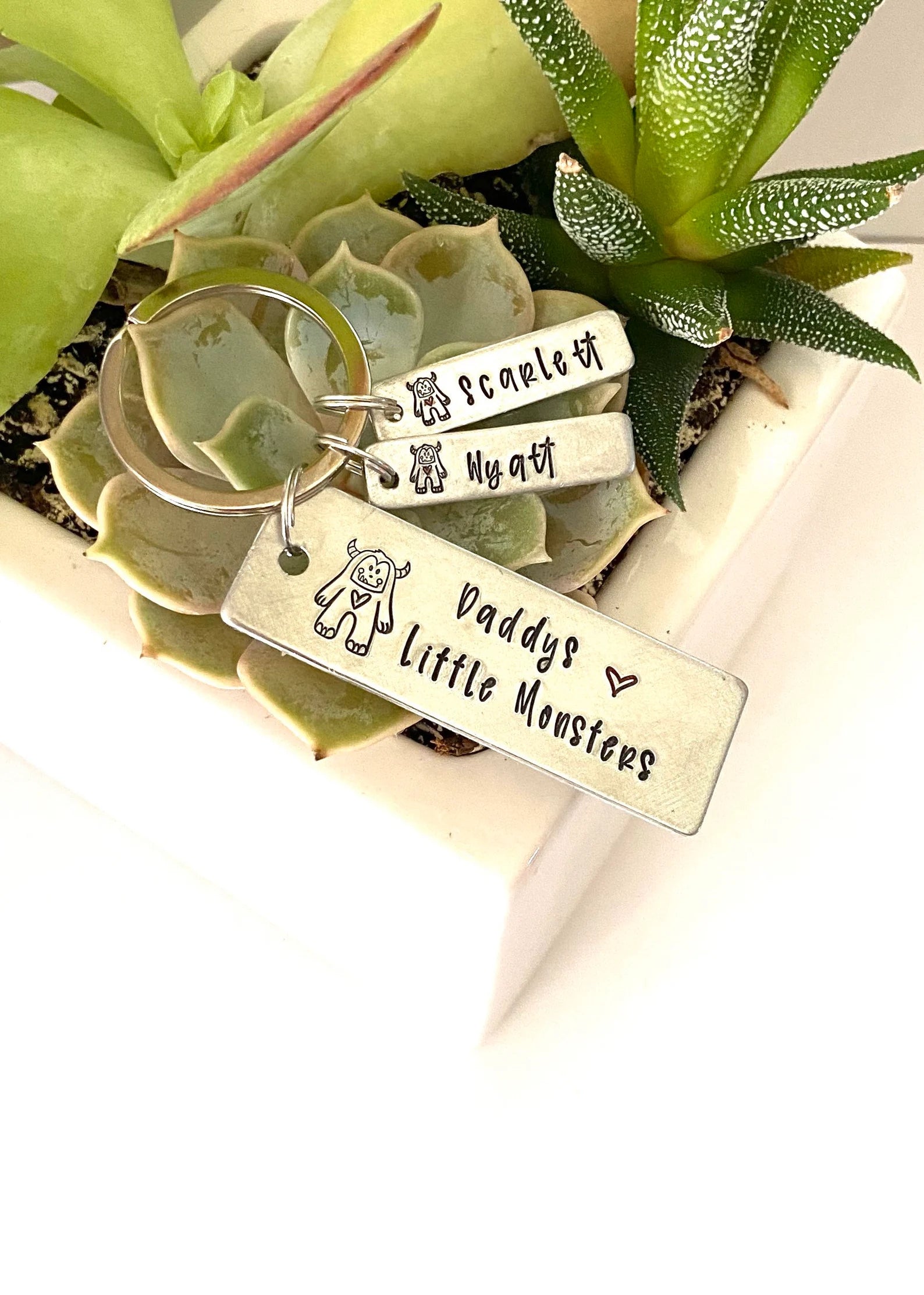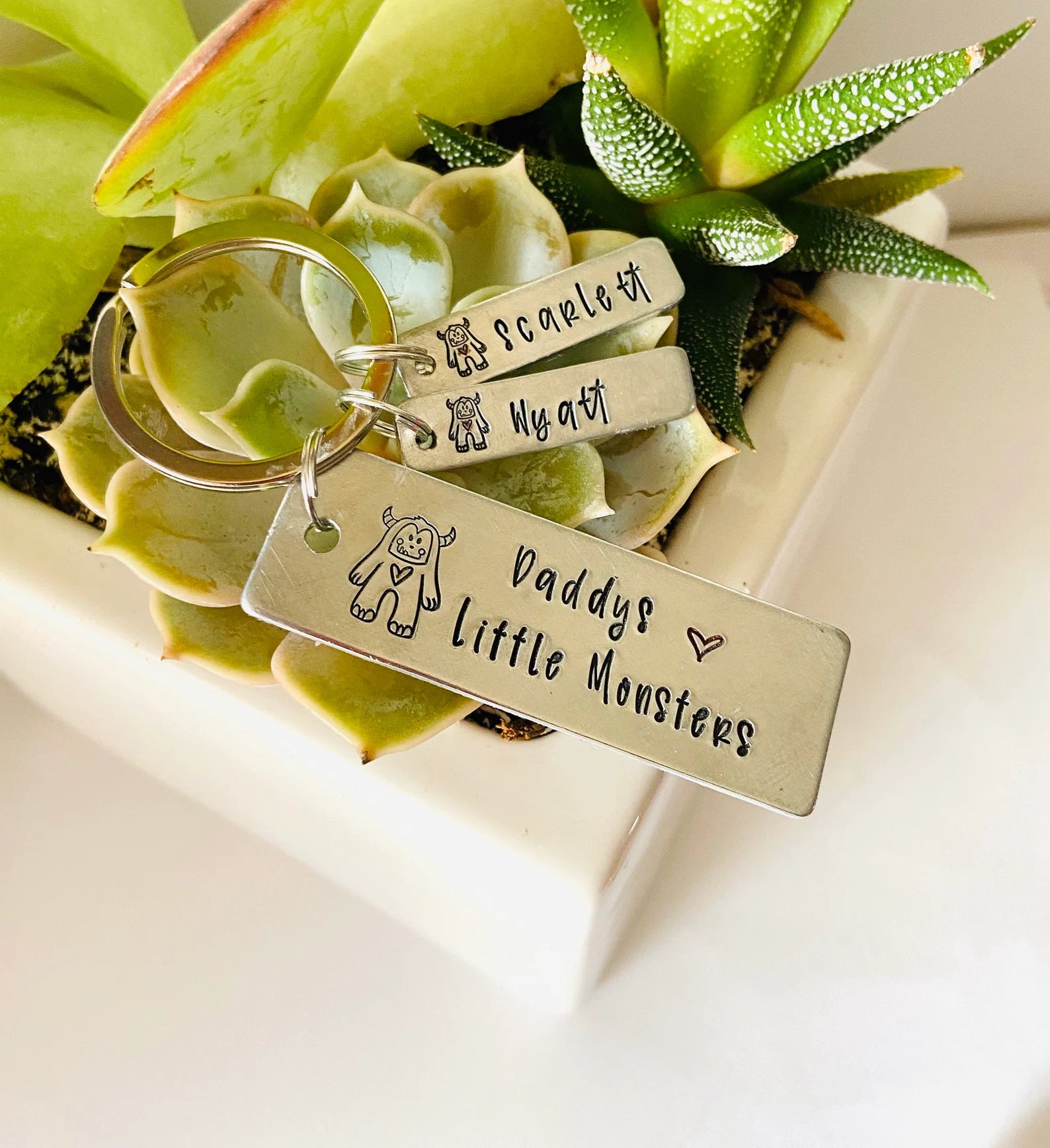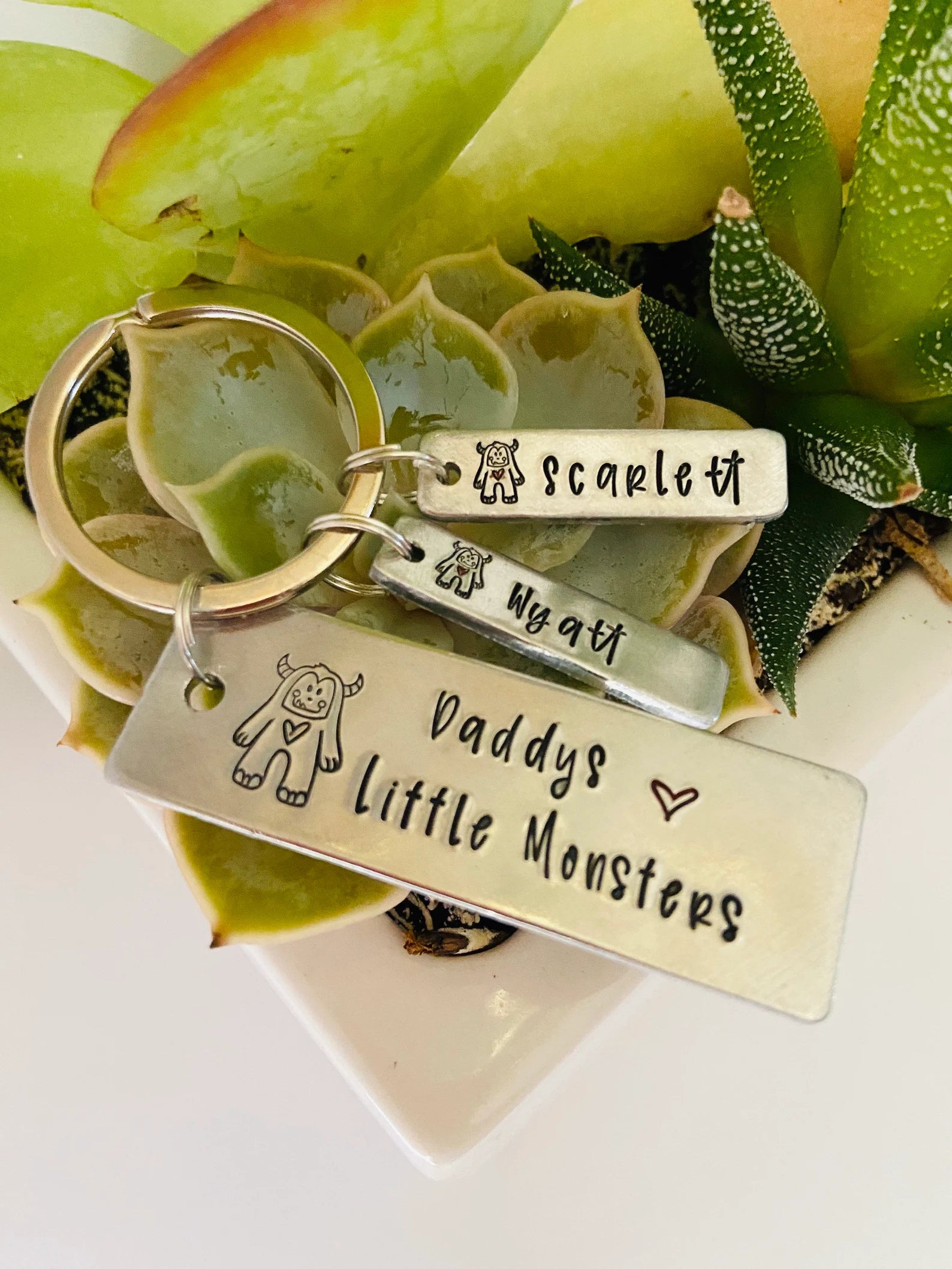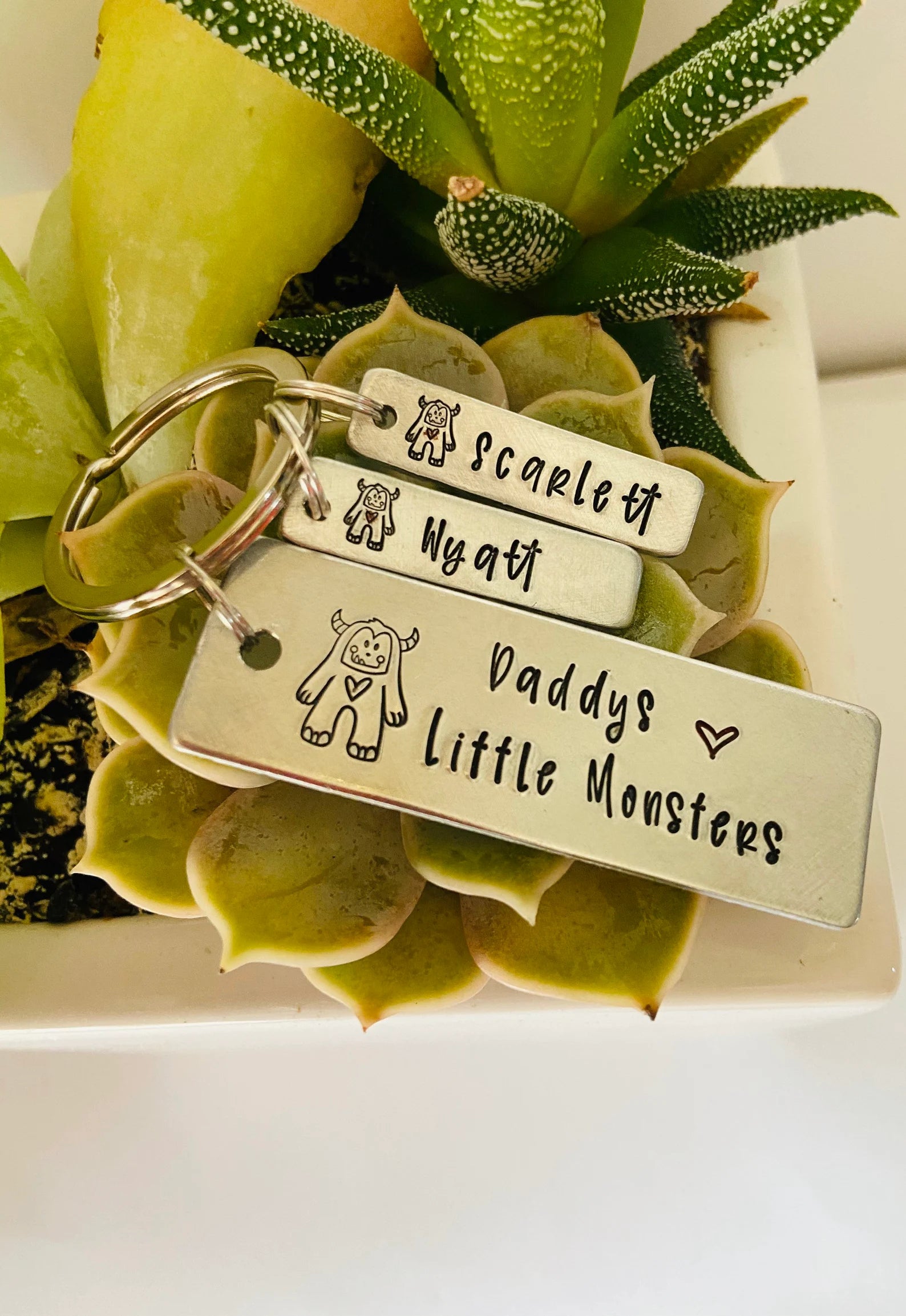The perfect Father’s Day gift for dad or grandpa! Daddy’s little monsters! Order this key chain hand stamped and personalized kids or grandkids names.