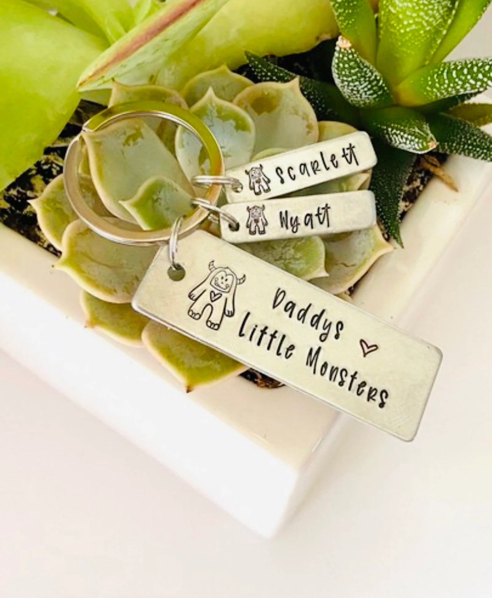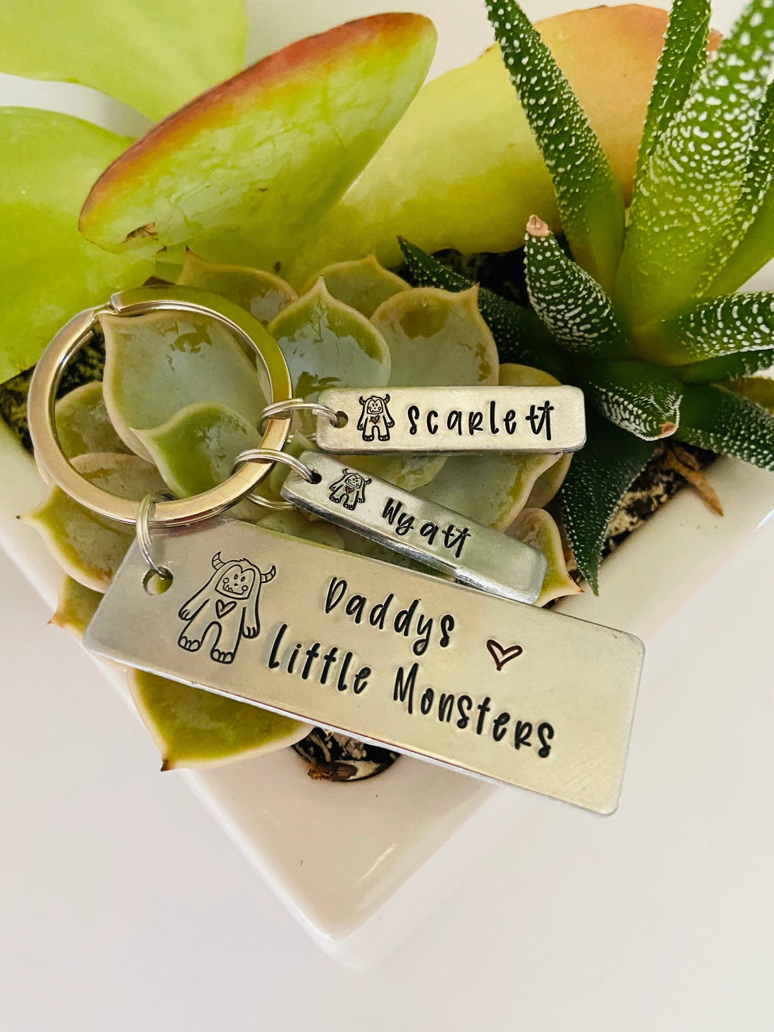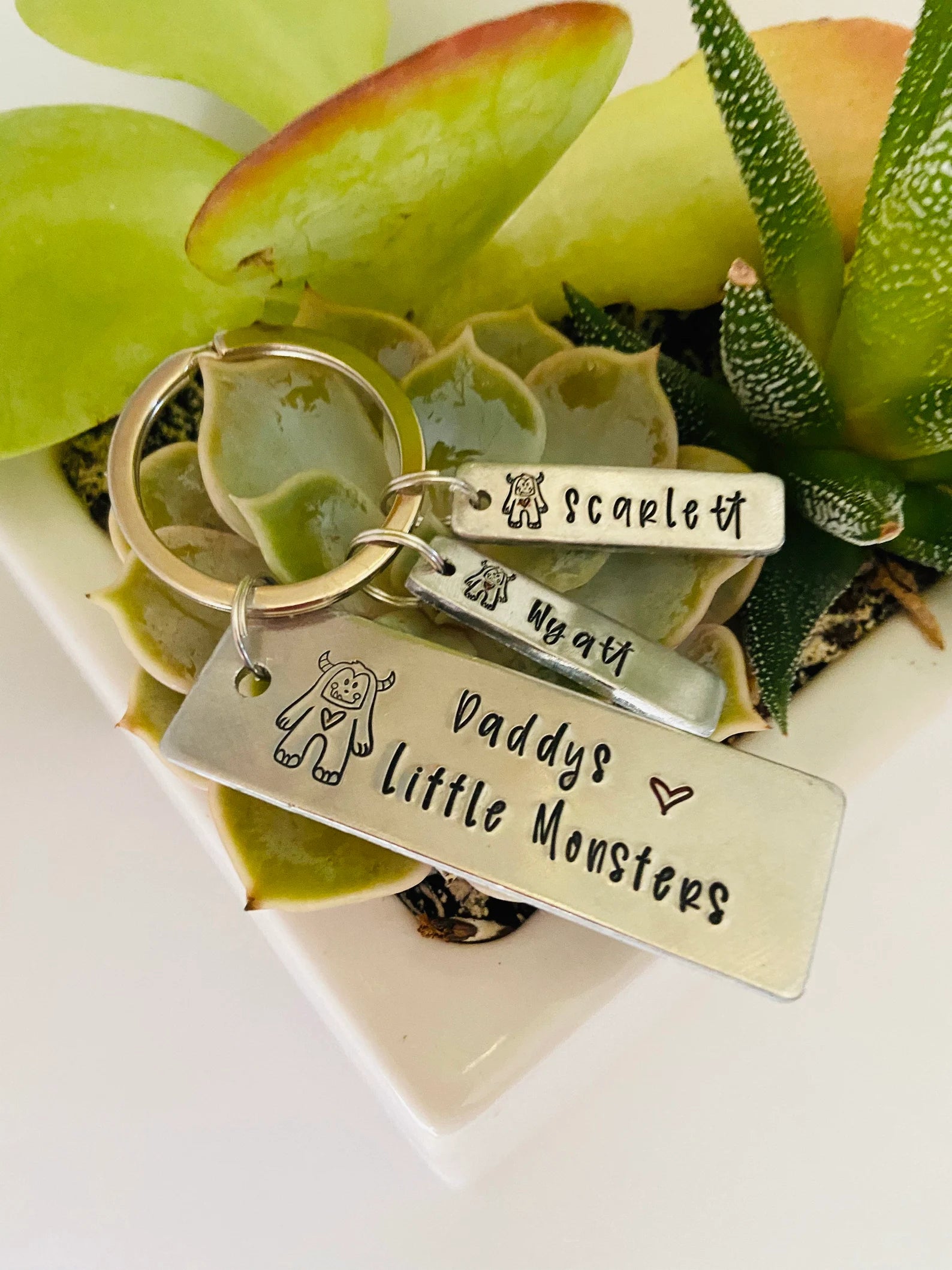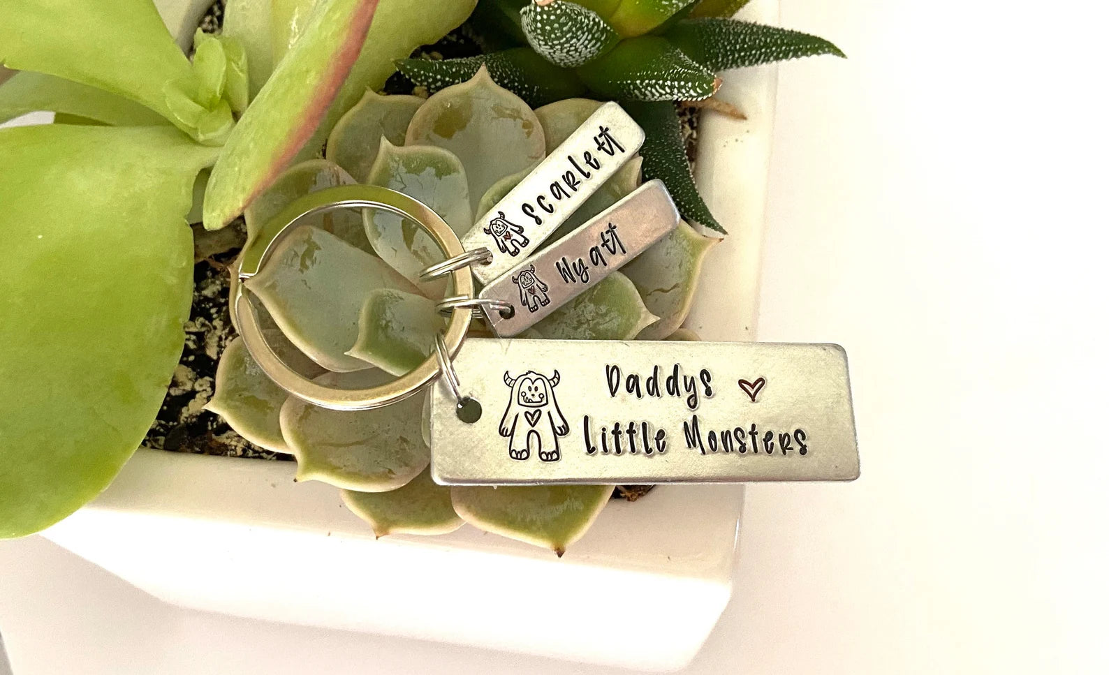 The perfect Father’s Day gift for dad or grandpa! Daddy’s little monsters! Order this key chain hand stamped and personalized kids or grandkids names.