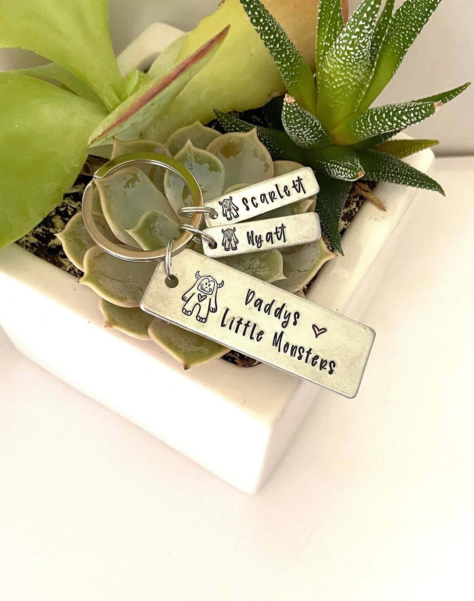 Daddy’s little monsters Father’s Day key chain personalized kids names hand stamped key chain Fathers Day grandpa papa gifts favored uncle