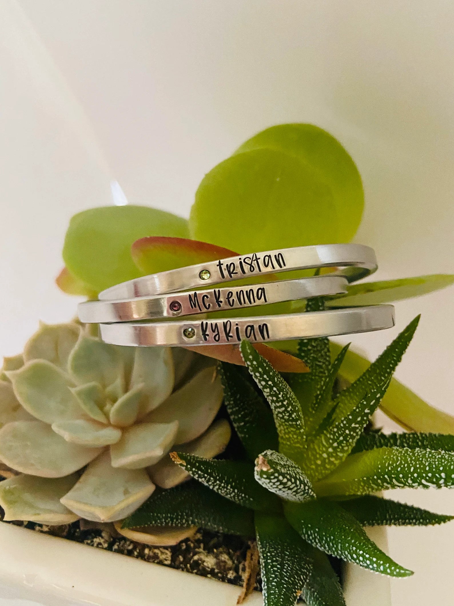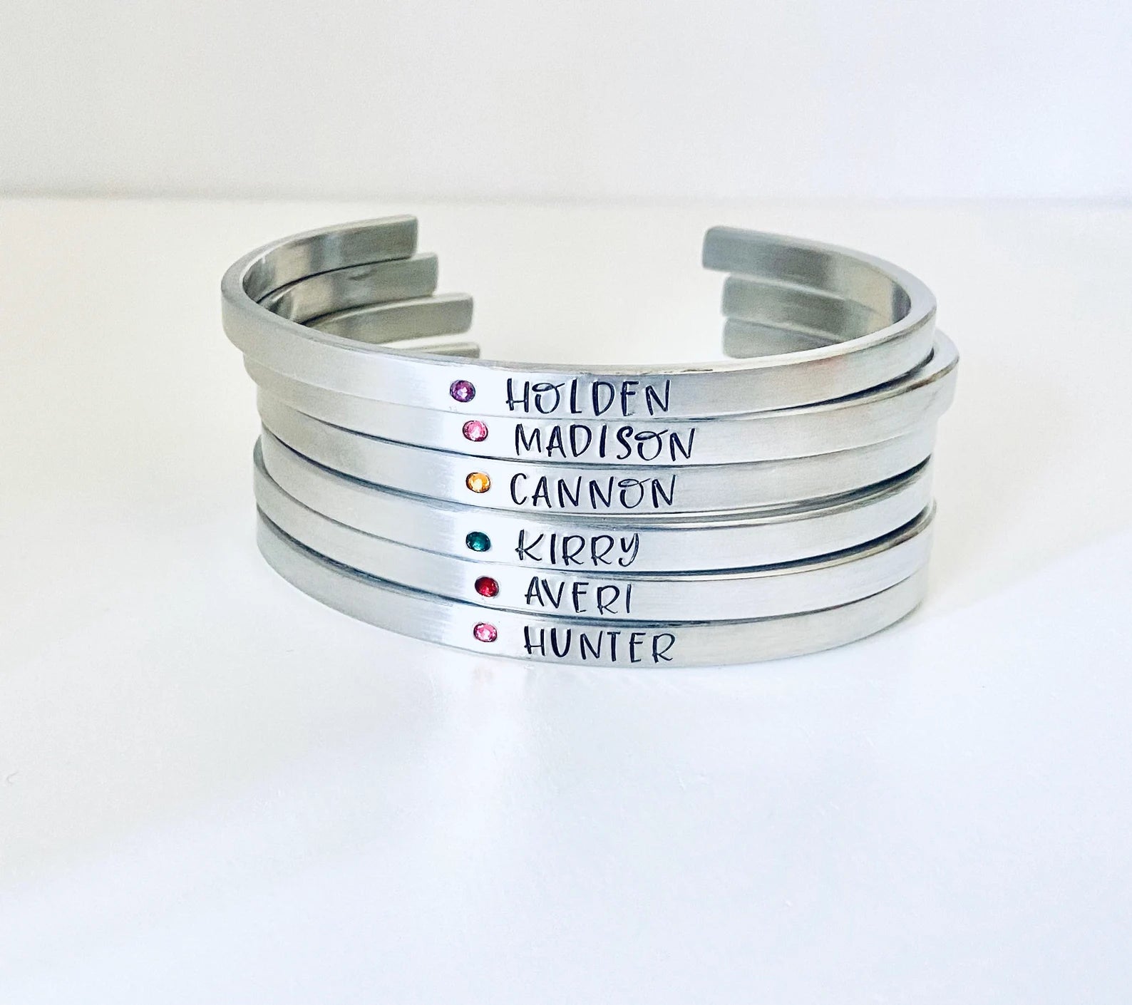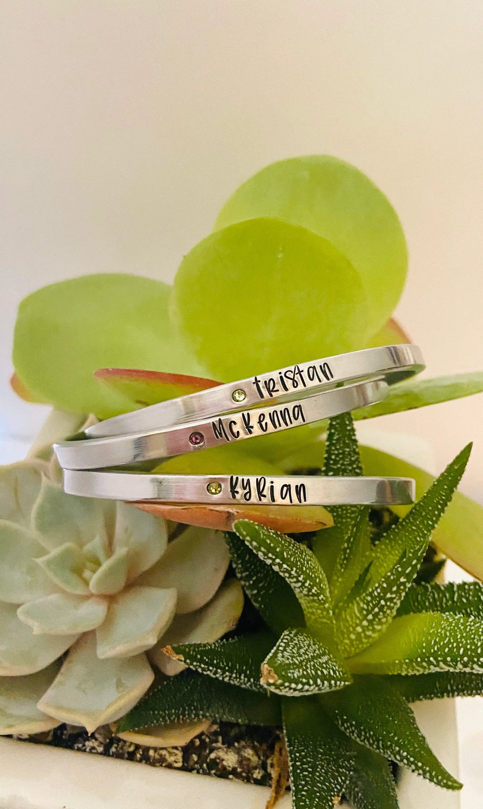 Super cute gift for the new momma or grandma. Beautifully hand stamped and customized with name and inset crystal birthstone Bracelet. Very sturdy. Fits wrist sizes 6"-7 1/2". Made of 11 gauge aluminum. Will not turn your wrist colors. Hand stamped with our newest font! They are the cutest skinny stacking bracelets! You can wear several at a time. Only one crystal and one name to a bracelet!