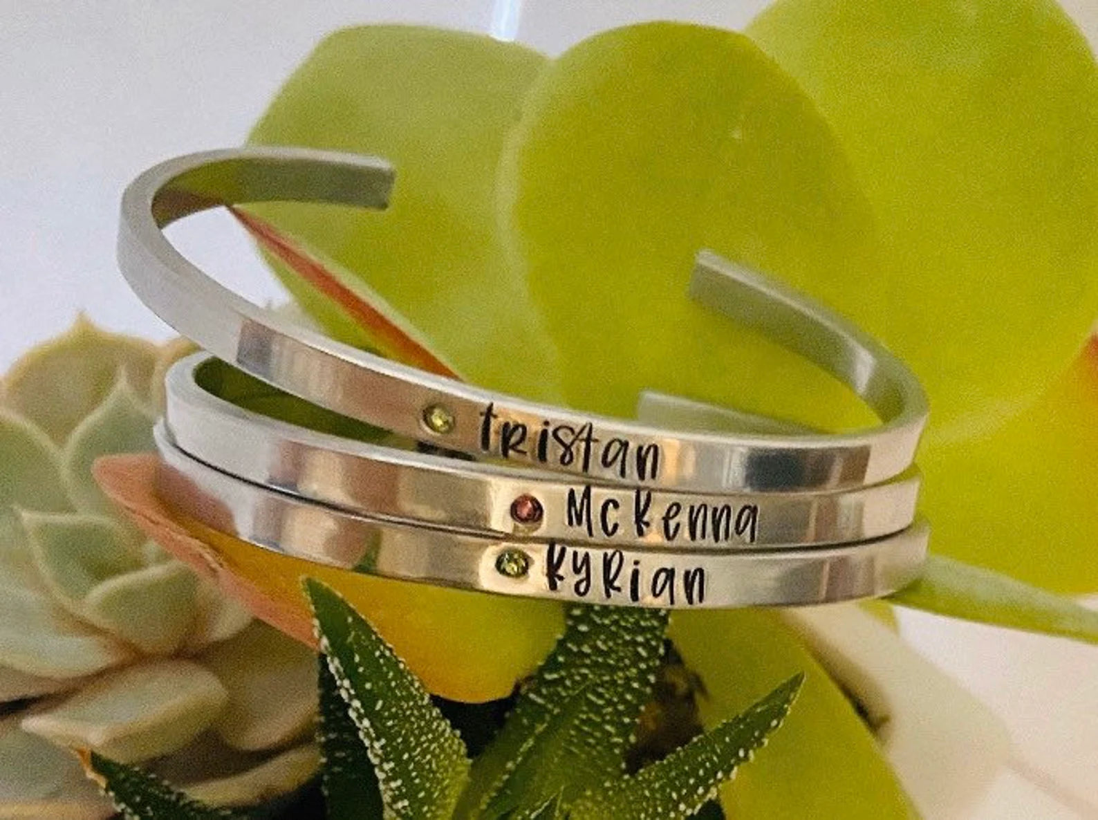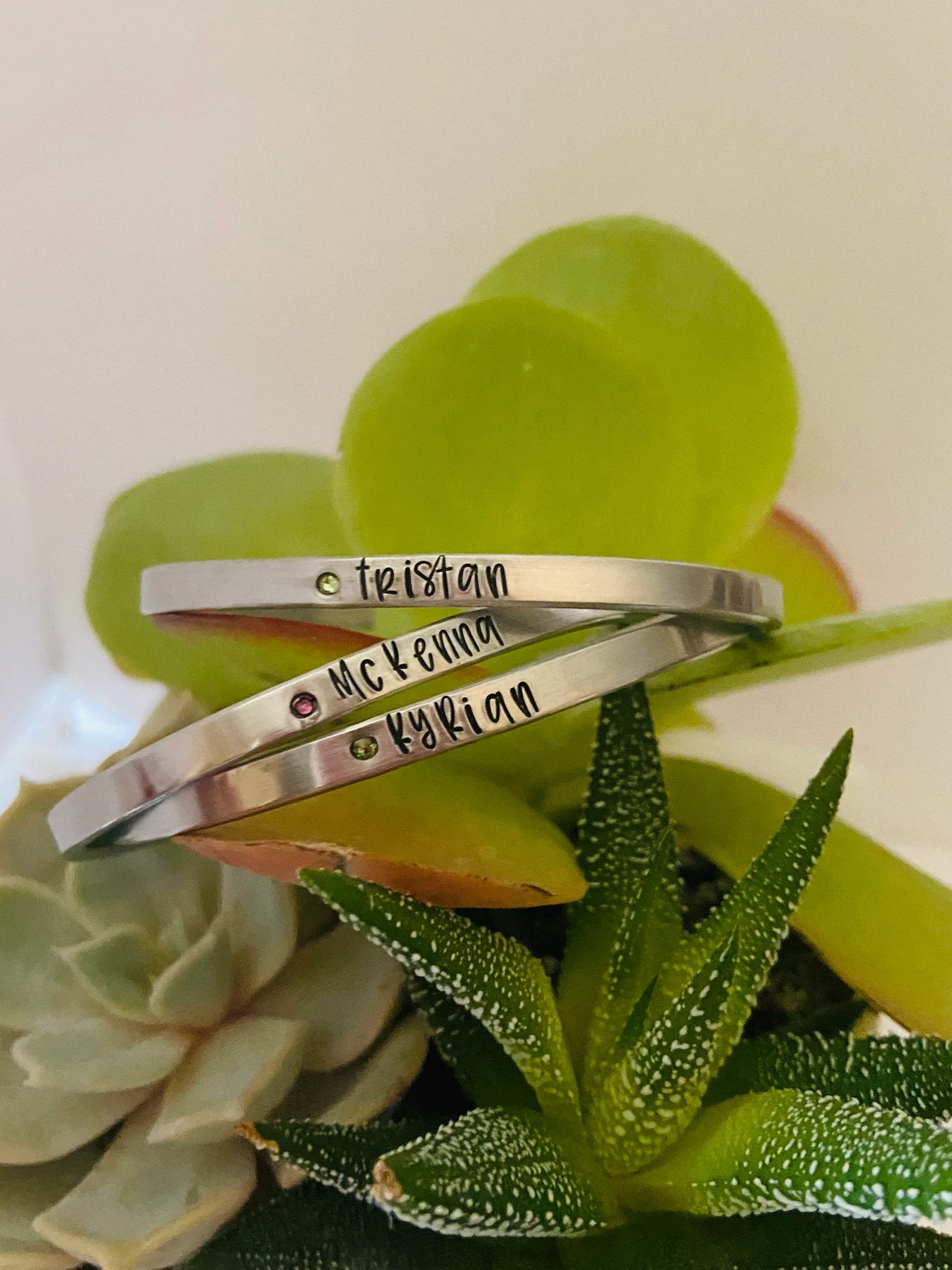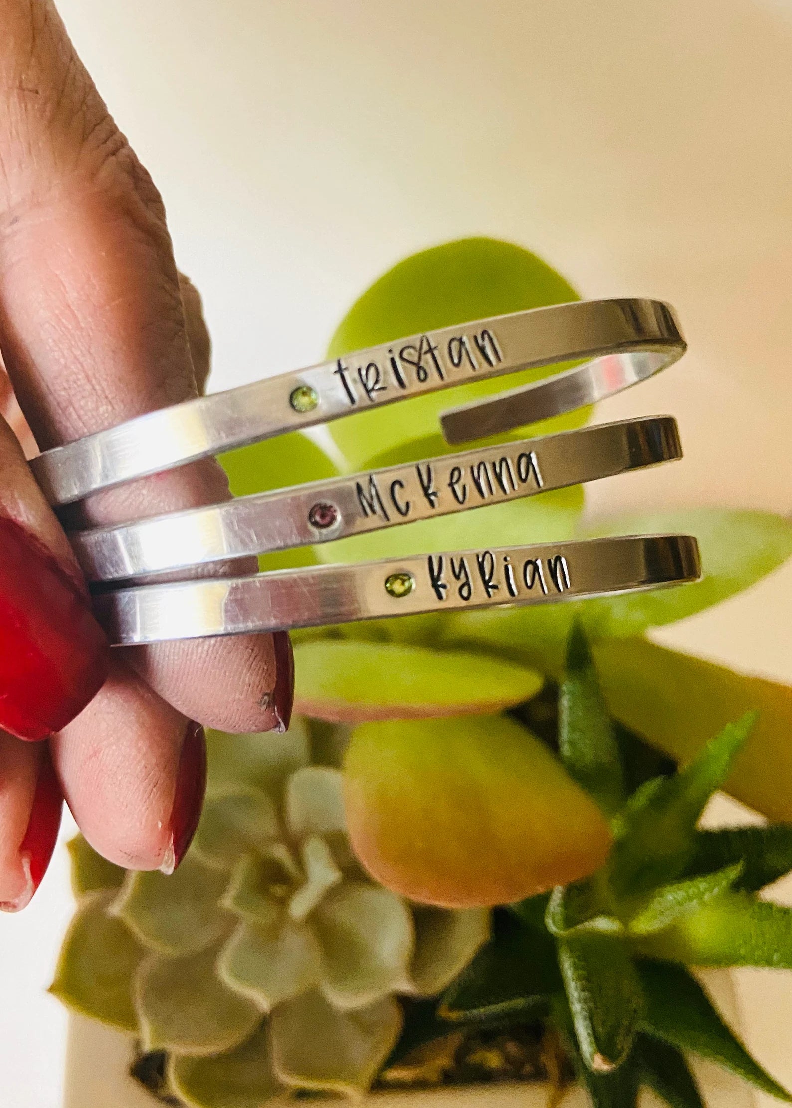 Super cute gift for the new momma or grandma. Beautifully hand stamped and customized with name and inset crystal birthstone Bracelet. Very sturdy. Fits wrist sizes 6"-7 1/2". Made of 11 gauge aluminum. Will not turn your wrist colors. Hand stamped with our newest font! They are the cutest skinny stacking bracelets! You can wear several at a time. Only one crystal and one name to a bracelet!